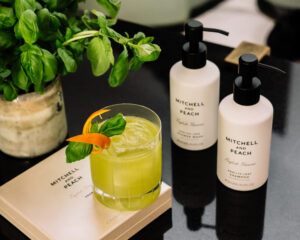 Fresh orange and lemon bring sunshine, while a dash of lime adds zest. Basil syrup lends herbal depth, balanced beautifully by a gentle fizz of soda water. The finishing touch? A fragrant basil leaf and twist of orange. Simple, striking and very much in keeping with the elegant, sensory world of Mitchell and Peach.